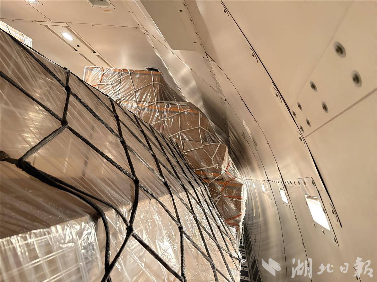 “鄂州—雅典”国际货运航线开通。机舱内装满出口货物。湖北日报全媒记者周鹏、通讯员王星予摄